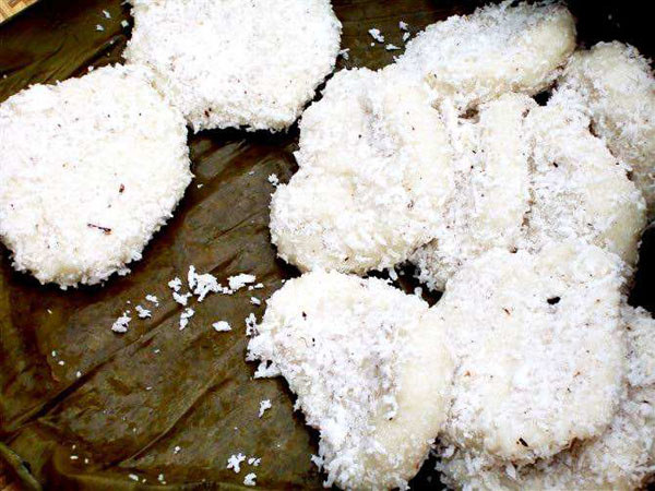 椰子粑清香可口,沾着用红糖制作的椰肉丝来吃,香甜、沁人肺腑。用精盐粉调制的椰肉丝粘配的椰子粑,清爽、不腻。